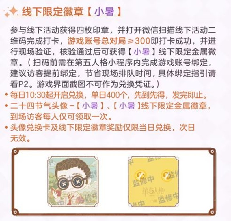 参与线下活动获得四枚印章,并打开微信扫描线下活动二维码完成打卡,游戏账号总对局乡300即打卡成功,并进行现场验证,核验通过后可获得【小暑】线下限定金属微章。(扫码前需在第五人格小程序内完成游戏账号绑定,建议访客提前绑定,节省现场排队时间,具体绑定指引请看P2。游戏界面截图不可作为兑换凭证。)2025年度欧利蒂丝庄园二十四节气演绎录活动单日徽章可领取数量为400个,单场活动800个。
