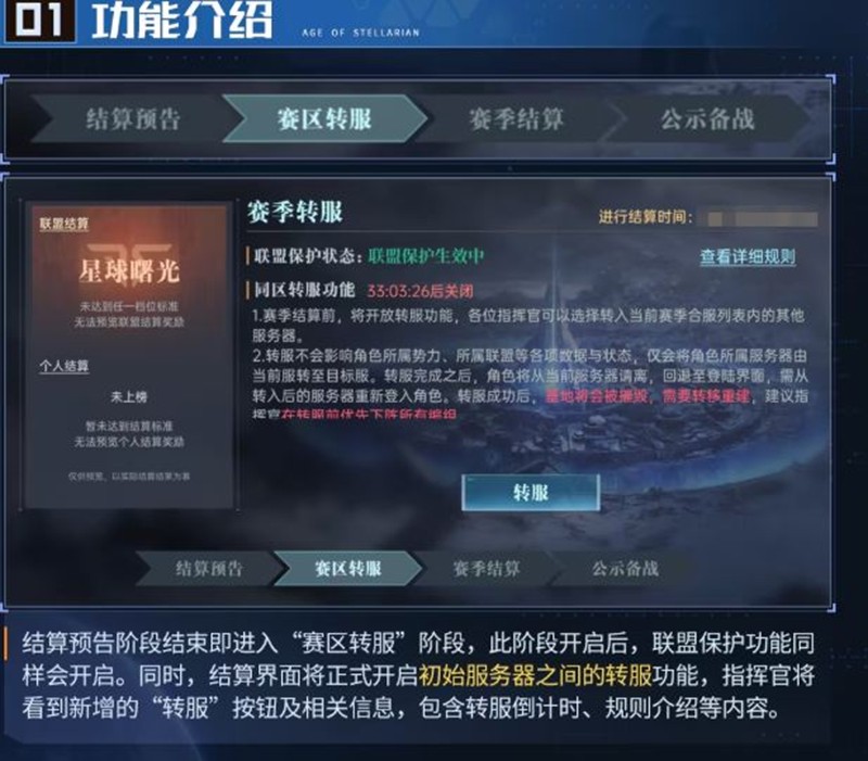 结算预告阶段结束即进入“赛区转服”阶段,此阶段开启后,联盟保护功能同样会开启。同时,结算界面将正式开启初始服务器之间的转服功能,指挥官将看到新增的“转服”按钮及相关信息,包含转服倒计时、规则介绍等内容。