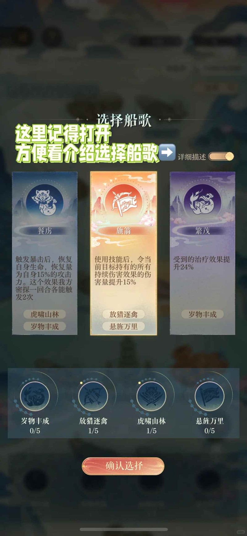 主要选择悬旌万里类型船歌,提高充能技伤,例如[传播] [幡动] [羽帜]