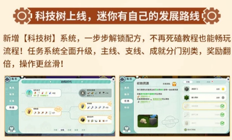 科技树系统是本次更新的核心内容之一。玩家可以通过解锁科技点来获得新的制作配方,逐步提升自己的科技水平。这个系统让游戏进程更加清晰有序,玩家可以根据自己的需求选择发展方向。迷你世界的科技树包含了从基础工具到高级机械设备的完整升级路线。