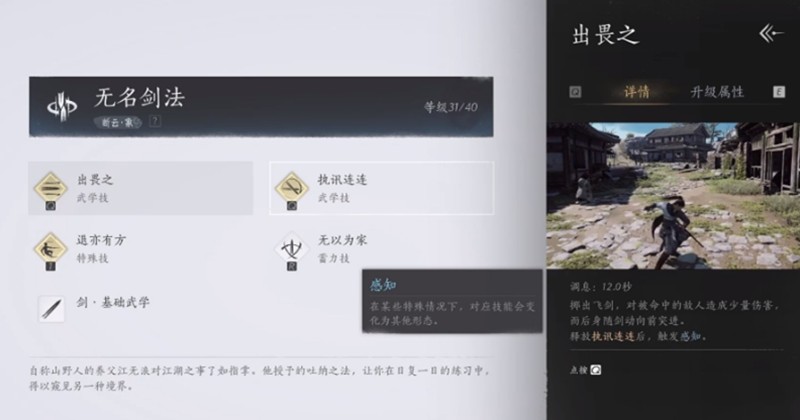 出畏之是无名剑法的起手招式,施展时角色会将佩剑掷出,同时身体随剑前冲。若在2秒内再次发动,角色会向前方连续斩击两次,并进入特殊的感知状态。此时继续使用出畏之会转化为执讯连连,快速斩出三剑后还能获得护盾保护。