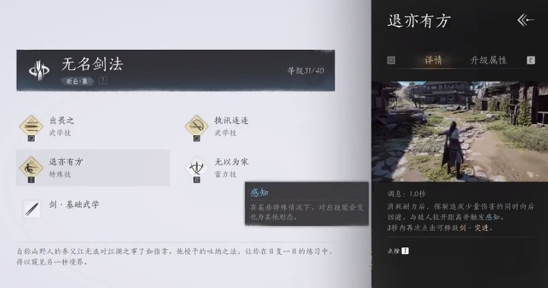 退亦有方是套攻守兼备的招式,施展时角色在挥剑斩击的同时会向后跳跃,既能攻击又能拉开距离。若处于感知状态下使用,还能额外发动一次,大幅提升闪避能力,在实战中能有效减少受到的伤害。同时小伙伴们搭配无名心法后,使用该技能后,可以长按蓄力发射三道剑气出去,心法六重后便可以实现无伤快速剑气释放,非常帅气。
