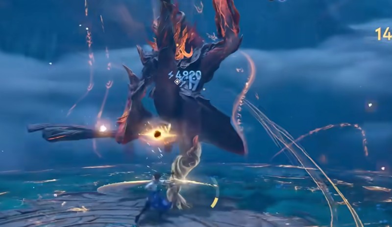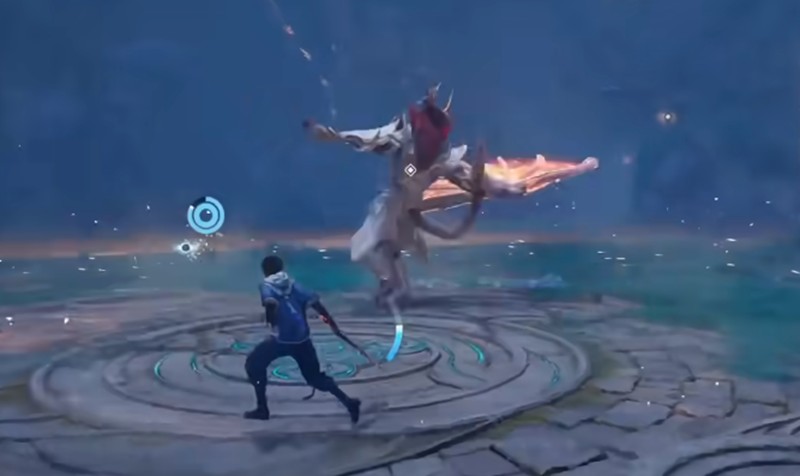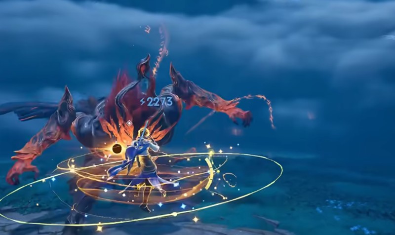 逐星归尘是东方曜的特色技能,释放后会挥出多道剑气攻击敌人。这个技能的特殊之处在于能与环境元素产生互动效果:在火焰区域使用时能附加灼烧伤害,在水域使用时则能造成减速效果。这种环境互动机制让东方曜在不同战场都能发挥独特优势。