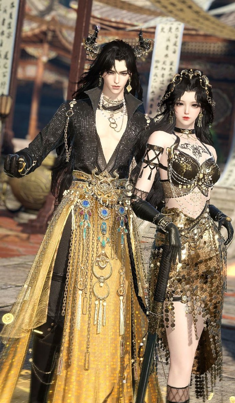 展示视频中,【金筹曜夜】以其华丽的金色主色调和精致的细节设计吸引了众多玩家的目光。时装整体风格融合了古典与现代元素,金色的流光效果在衣摆间流转,搭配独特的刺绣工艺,展现出非凡的质感。此外,视频还展示了时装在不同场景下的动态效果,包括行走、攻击等动作,特效华丽且极具视觉冲击力。