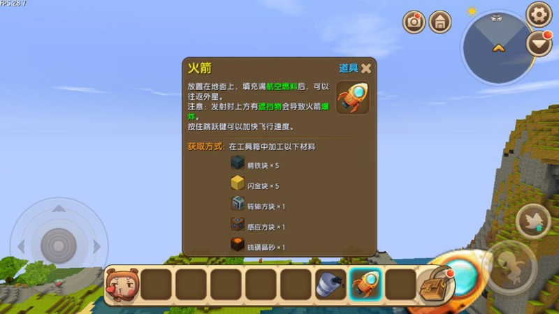 前往萌眼星需要先制作火箭,材料包括5块精铁块、5块闪金块、1块转轴方块、1块感应方块和1块硫磺晶砂。
