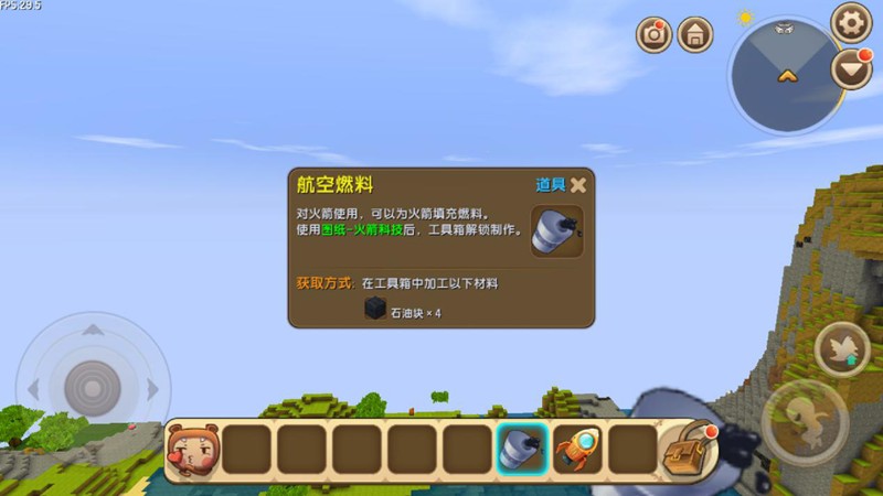火箭还需要航空燃料才能飞行,每次往返需要消耗5桶燃料。航空燃料的配方需要先击败黑龙获得图纸,每桶燃料需要4块石油块合成。石油块可以在深海或萌眼星上采集。准备好这些后,就能乘坐火箭前往萌眼星了。