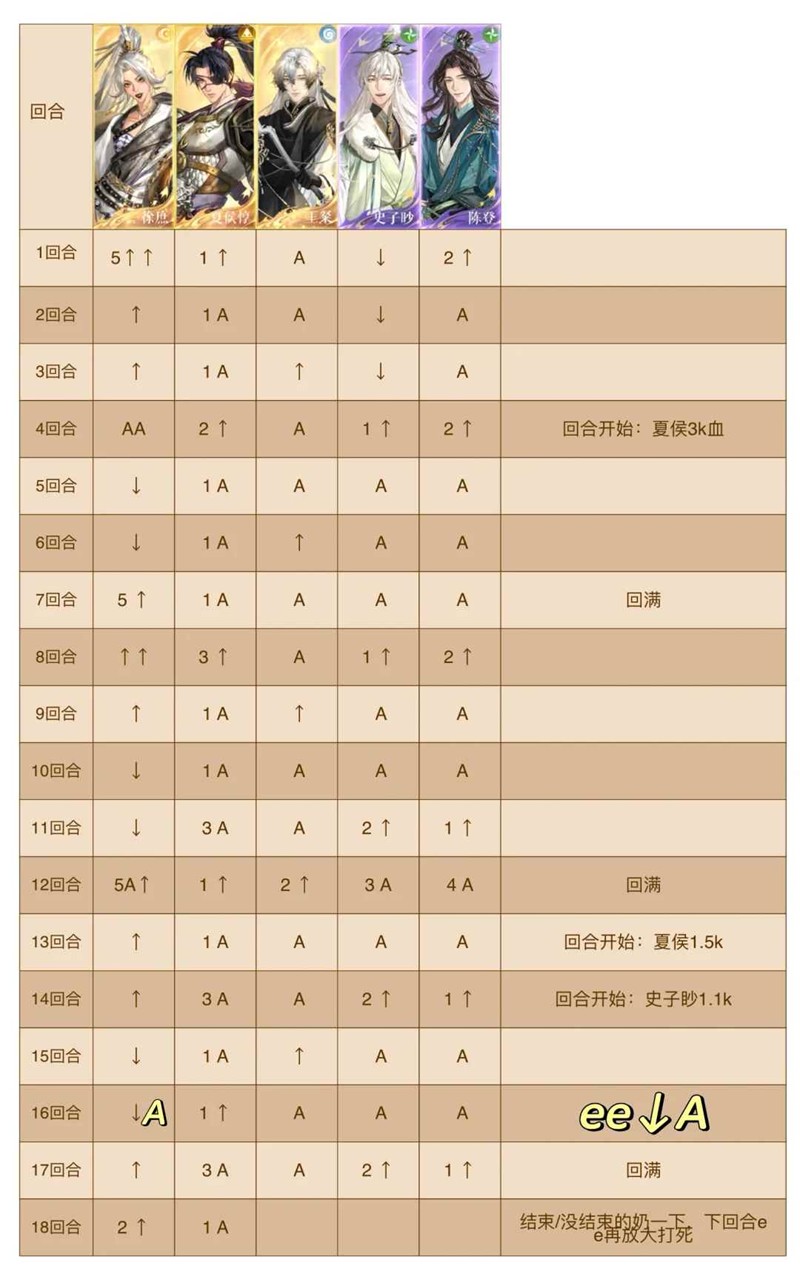 除56 1011 1516这六个回血回合,该密探下拉(谁身上有紫框谁下拉),其余回合怎么输出高怎么操作