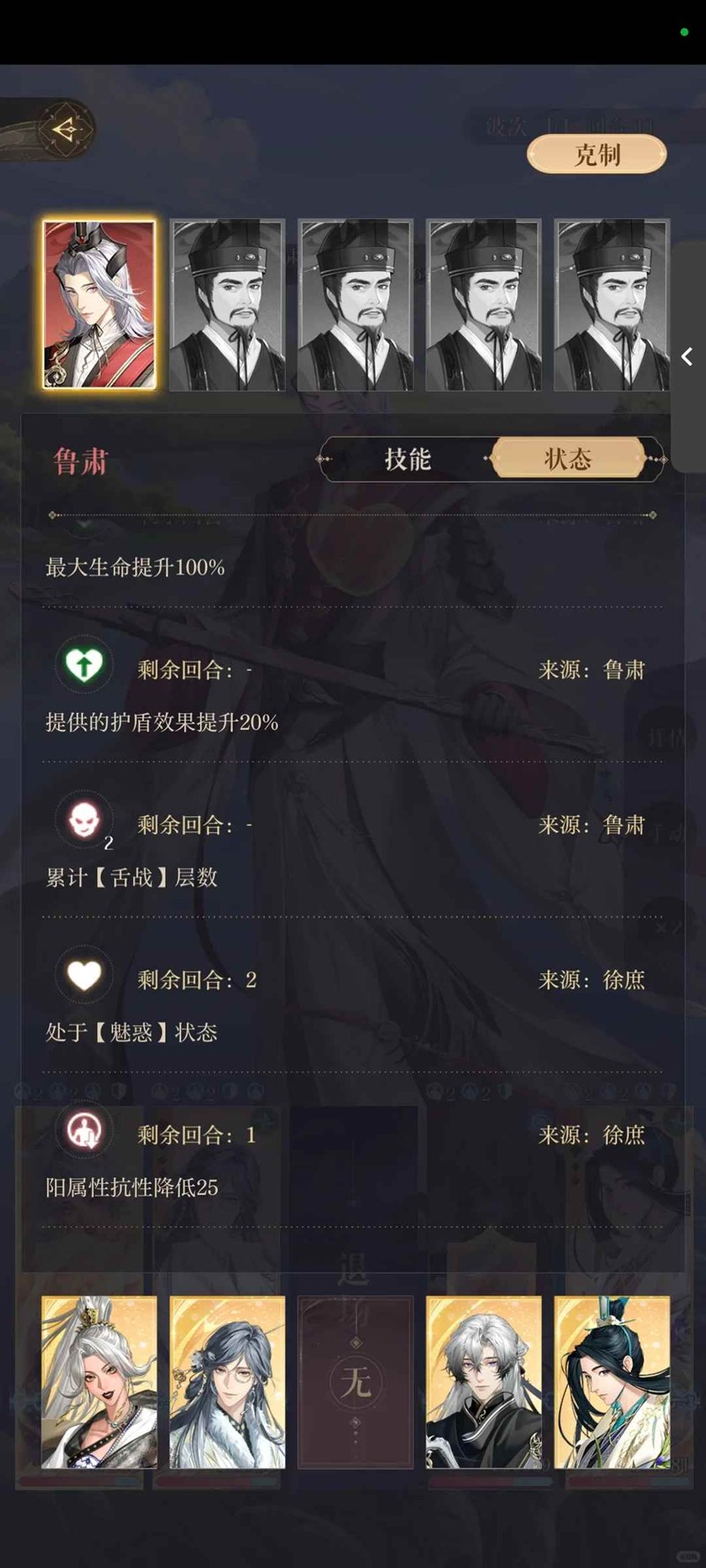 操作手法:依赖传幡多打伤害,第一回合从张邈开始放大,一个动链走完停在一个人身上不放大了之后队友除了徐庶全部平A。在第一回合之后,注意操作手法,选择有大的队友依次放大,再次形成动链。期间控制舌战数量,直到鲁肃第一条血被打空张飞退场,后面就是主要打鲁肃见机打文官,时不时吃传幡的buff