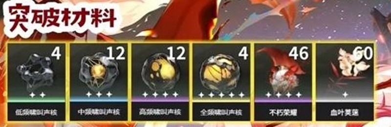 露帕角色突破需要46个不朽荣耀、4个全频啸叫声核、12个高频啸叫声核、12个中频啸叫声核、4个低频啸叫声核、60个血叶荚莲、122个特级共鸣促剂以及170000贝币。其中不朽荣耀可以通过挑战荣耀狮像boss获得,血叶荚莲则可以在富集区采集或商店购买。