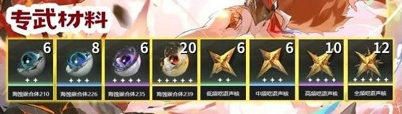 露帕的专属武器突破需要12个全频啸叫声核、10个高频啸叫声核、6个中频啸叫声核、6个低频啸叫声核,以及40个各类海蚀嵌合体。这些材料都需要玩家在游戏中通过特定方式获取。