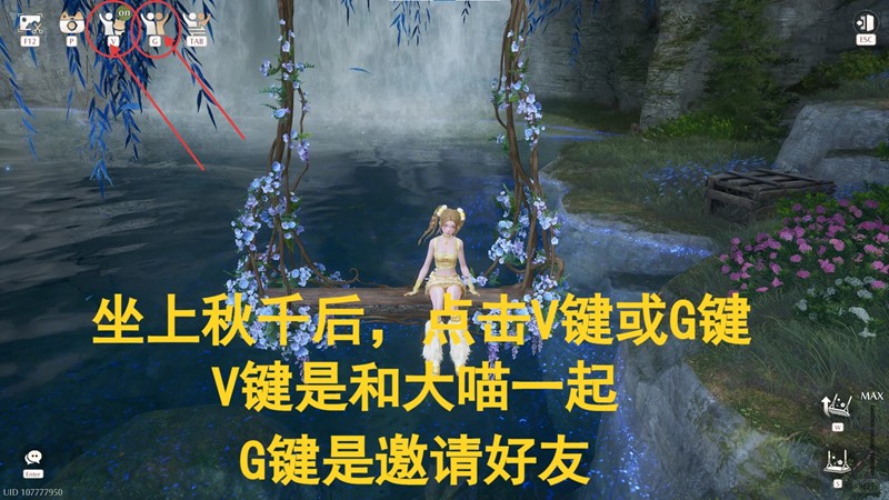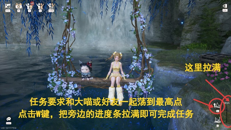 传送过去,坐上秋千,点击上面的按键,PC端是V键出现大喵一起,G键是邀请好友一起;出现大喵和好友后,再按右边的键位,PC端按W键,把旁边的进度条拉满就是荡到最高点。