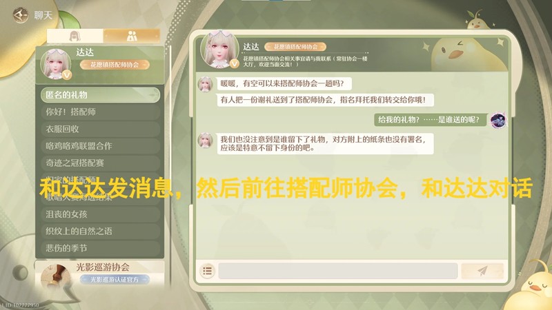 完成后,打开美鸭梨,和达达发送消息,前往搭配师协会找到达达,询问关于匿名礼物,获得一个感谢信;