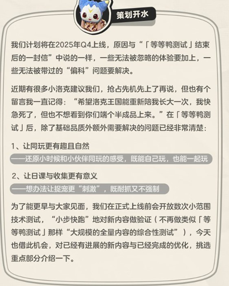 近期有很多小洛克建议我们,抢占先机先上了再说,但也有个留言我一直记得:“希望洛克王国能重新陪我长大一次,我快急死了,但也不想看到你们端个半成品上来。”在「等等鸭测试」后,除了基础品质外额外需要解决的问题已经非常清楚: