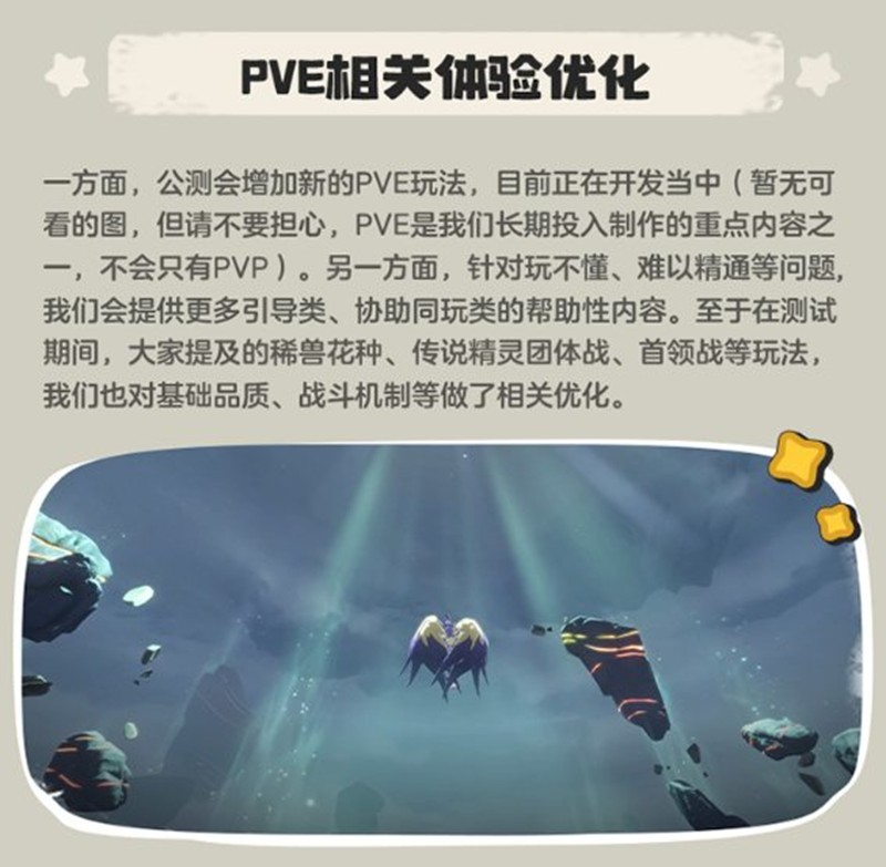 在pve玩法方面,官方表示一方面,公测会增加新的PVE玩法,目前正在开发当中(暂无可看的图,但请不要担心,PVE是我们长期投入制作的重点内容之一,不会只有PVP)。另一方面,针对玩不懂、难以精通等问题我们会提供更多引导类、协助同玩类的帮助性内容。至于在测试期间,大家提及的稀兽花种、传说精灵团体战、首领战等玩法我们也对基础品质、战斗机制等做了相关优化。