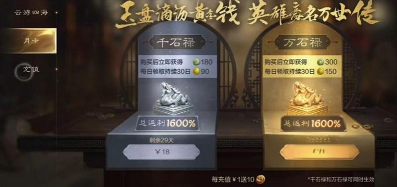 大月卡售价30元,小月卡售价18元。从性价比来看,大月卡更值得推荐,因为它能提供更丰厚的游戏资源奖励。购买月卡后,玩家每天都能领取固定数量的黄金和玉石,这些资源在游戏中非常重要。