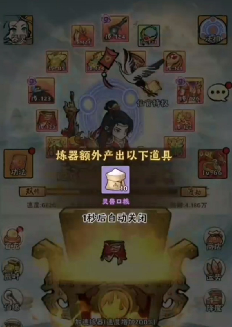 炼器鼎的升级也很重要。提升炼器鼎等级可以增加开启宝箱时的经验奖励,建议在炼器鼎达到8级后囤积宝箱一次性开启,这样可以最大化经验收益。