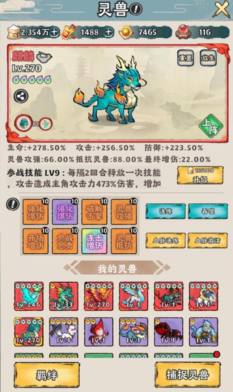 麒麟是平民玩家逆袭的关键灵兽。在触发弑神者状态后,配合金乌血脉可以发挥出惊人的战斗力。通过参与异兽挑战活动积攒碎片,就能逐步培养出这只强力灵兽。麒麟在持久战中表现尤为出色,是平民玩家组建阵容的核心选择。