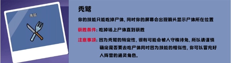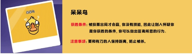 呆呆鸟需要通过精湛的演技让其他玩家误以为自己是鸭子;鹈鹕可以吞噬其他玩家,被吞噬的玩家在会议前不会死亡;秃鹫需要寻找并吞食尸体来获得胜利;鸽子的目标是感染所有玩家,过程中要躲避鸭子的攻击。