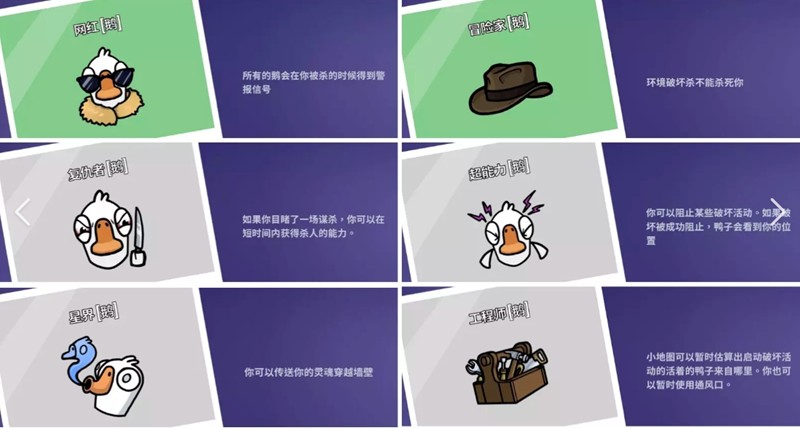 警长拥有击杀权但需要承担误杀风险;保镖需要保护特定玩家来获得奖励;通灵鹅可以看到死亡玩家的灵魂;网红死亡时会向所有鹅阵营玩家发送警报;肉汁完成任务可以获得额外赏金;工程师可以使用通风口快速移动;窥探者擅长隐藏观察;观鸟者拥有穿墙视野;正义使者可以无惩罚击杀任何玩家;殡仪员可以调查尸体;复仇者目睹谋杀后能短暂获得击杀能力;侦探鹅可以查验玩家是否动过刀;模仿鹅可以伪装成鸭子混入敌方阵营。