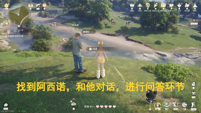 我们先传送至“河畔山地林间道”锚点,点击追踪任务,找到阿西诺,和他对话,接取任务;