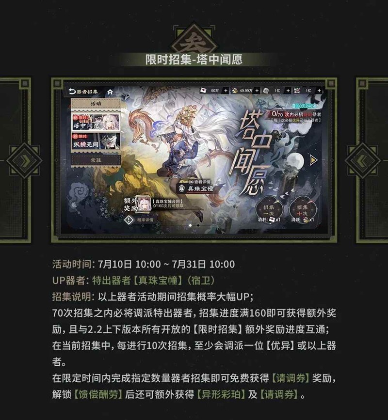 活动期间,特出器者【真珠宝幢】(宿卫)招集概率大幅提升。