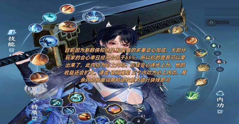 内功方面抉择:目前因为新群侠和绝技 和装备的多重会心加成,大部分玩家的会心率已经不会低于55%,所以你的昆吾可以拿出来了,此内功为必上内功。后续会心逐步上升,他的收益还会扩大。逢虚 破霄摧星 三个内功为必上内功,其余内功根据词条和进攻能力进行抉择即可。