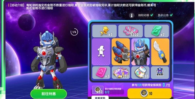 7月18日至9月12日,香肠派对开启擎天圣荣耀转盘,使用金刚币或糖果抽取擎天圣套装、能量双枪皮肤、小叉子近战皮肤、战场动作“巨无霸,变形!”及气泡表情“直视我!”。累计抽取还能再得金刚币与派对卡背景。
