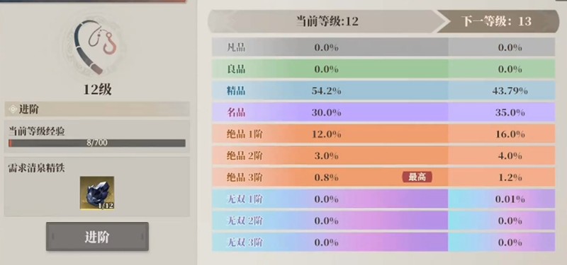 装备品质与渔弋等级密切相关。从最低的凡品到最高的无双三阶,渔弋等级越高,获得高品质装备的概率就越大。提升渔弋等级需要达成一定钓鱼次数,并消耗清泉精铁进行进阶。清泉精铁主要通过试炼兵械库获得。