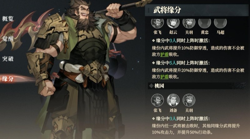 蜀国桃园队的核心成员是刘备、关羽和张飞这三位传奇武将,当他们同时上阵时会触发"桃园结义"羁绊效果,为全队提供10%物理穿透加成,并且本次攻击不会被护盾吸收。这个特性在面对高防御阵容时特别有效,能够有效克制依赖护盾的对手。需要注意的是,该羁绊的触发条件是任一缘分武将被击败,因此在PVE玩法中实用性相对较低。