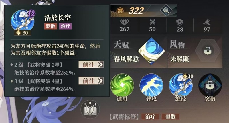 蔡文姬的治疗技能能为指定友方提供240%生命值的治疗量,虽然群体回血能力稍弱,但三星解锁驱散技能后,她能为目标及相邻友方各驱散一个减益效果。这个能力在面对敌方施加的眩晕、冰冻等负面状态时尤为关键,能有效保障队友的输出环境。此外,她还能为队友提供20%的免伤率加成,觉醒后自身免伤系数更可提升至30%。