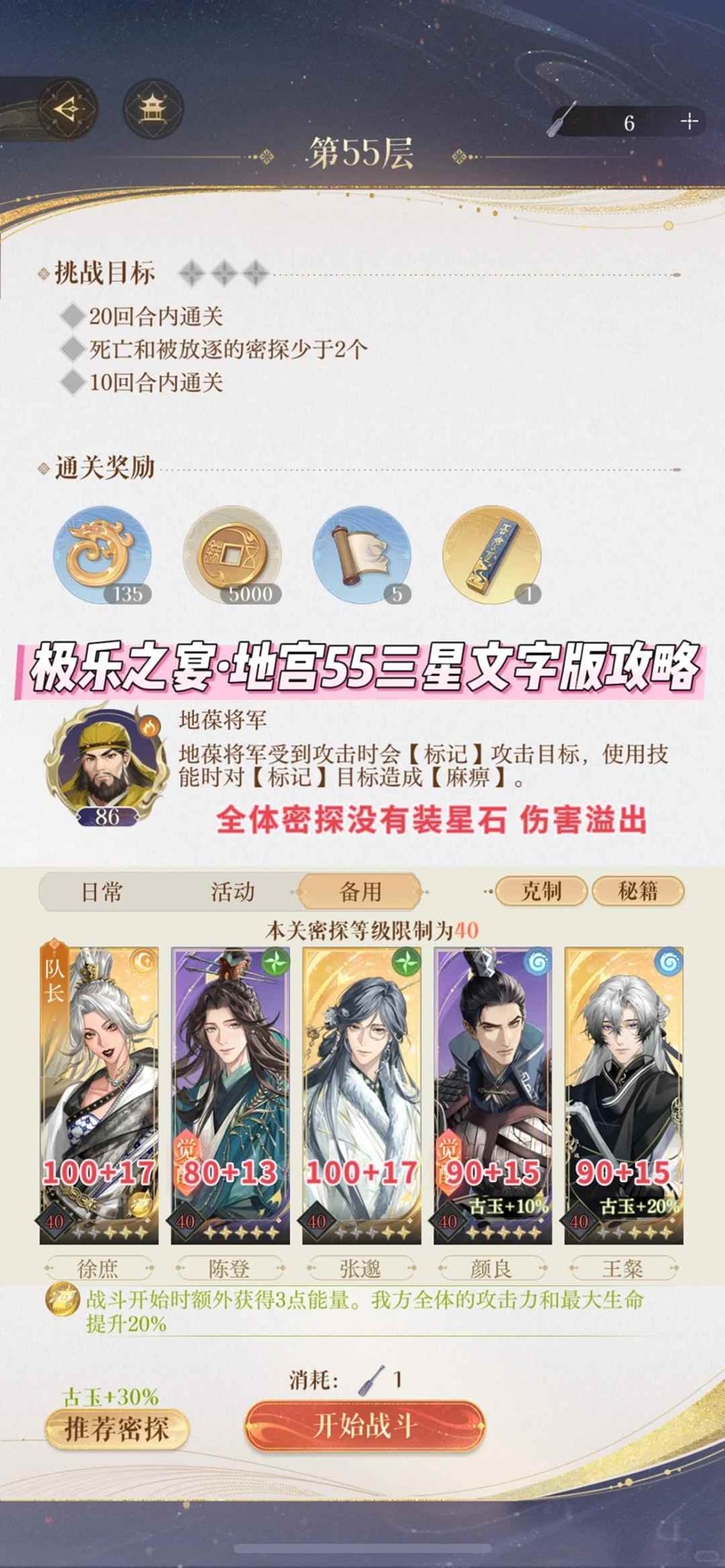 以上就是如鸢地宫55怎么打,极乐之宴地宫55三星文字版攻略的全部内容了,更多游戏资讯,攻略内容敬请关注切游网,您的支持是我们努力的动力!