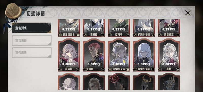 银与绯的常驻卡池中,SSR角色的基础出货率为0.6%。不过得益于完善的保底机制,当玩家进行60次命运宣告后必定能获得SSR眷属,这使得综合概率提升至1.6%左右。祈愿画匣系统允许玩家在40抽后预设心仪角色,当触发SSR时有50%概率锁定预设角色,这个功能大大提高了获取目标角色的可能性。