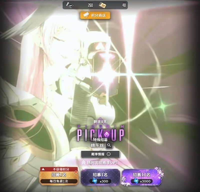 游戏中共有六个不同的卡池可供选择。小美人鱼米卡池、哈拉羁绊十连卡池、普通招募卡池、社交点数招募卡池、付费十连卡池以及新人教学指南十连卡池。其中新人教学指南十连卡池是最推荐新手参与的,使用十张普票就能保底获得一个金色角色,不过这个池子里的角色都是开服时期的经典角色,不包括朝圣者。
