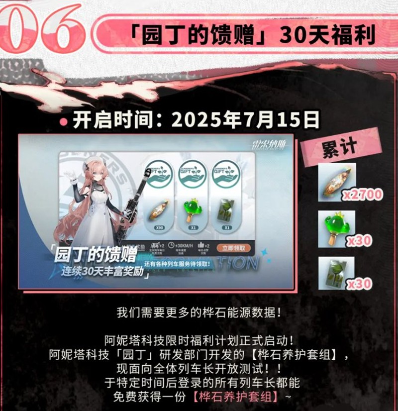 阿妮塔科技「园丁」研发部门开发的【桦石养护套组】现面向全体列车长开放测试!!于特定时间后登录的所有列车长都能免费获得一份【桦石养护套组】
