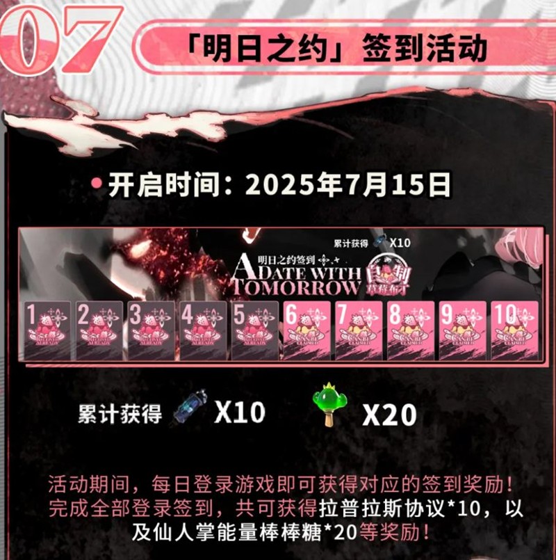 活动期间,每日登录游戏即可获得对应的签到奖励!完成全部登录签到,共可获得拉普拉斯协议*10,以及仙人掌能量棒棒糖*20等奖励!