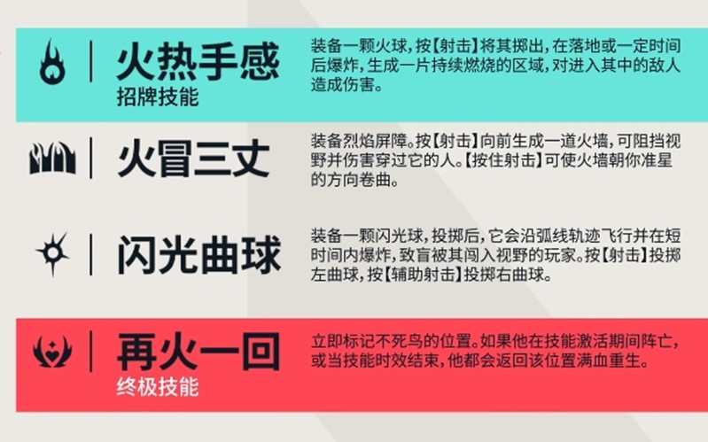 不死鸟的一技能"火墙"每回合可使用一次,能施放一道阻挡视野的火焰屏障。这道火墙不仅能对敌人造成30点伤害,还能为不死鸟提供生命恢复效果。使用时要注意火墙距离较短,建议瞄准转角或门口等关键位置。准星向上抬可以让火墙投掷得更远,移动时施放还能控制火墙的走向。