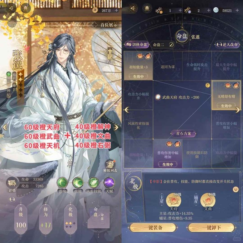 1. 张邈必须是二星,命盘必须有无晴+能量+3,如果攻击伤害比我低也必须有普中,有完美无晴盘当然更好