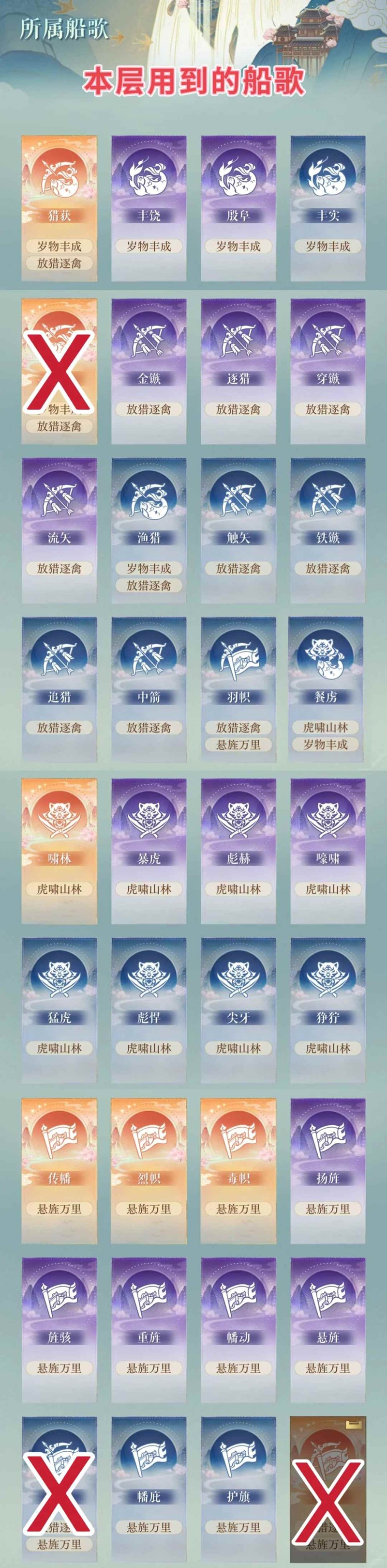 推荐船歌: 传幡 重旌 幡动 毒箭 幡庇 护旗 羽帜 扬旌 暴虎 彪赫 丰饶(必选传幡,重旌,幡动,幡庇,护旗,羽帜)