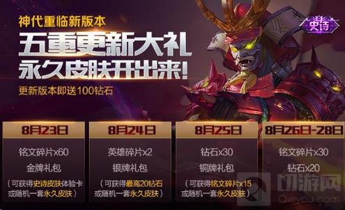 版本更新后首日登录送铭文碎片*60+金牌礼包*1,金牌礼包打开获得随机一张史诗及以上皮肤3日体验卡,或永久皮肤(全服15W套)