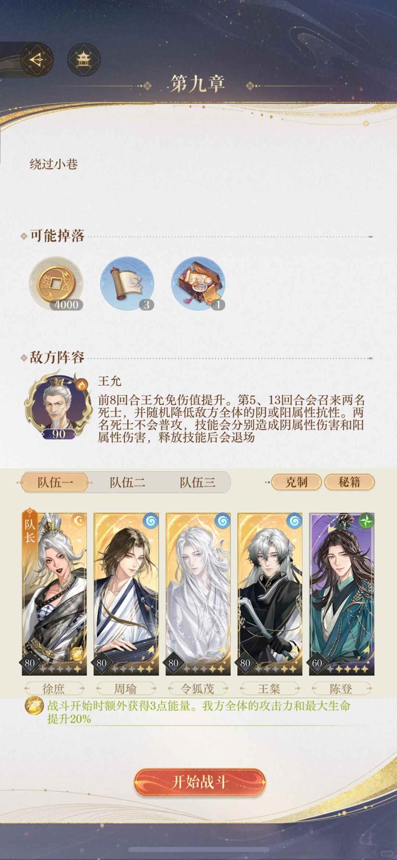 如鸢游戏以策略卡牌和沉浸式剧情为核心玩法,共有傅融、刘辩、袁基、左慈、孙策五位男主,玩家只需完成指定任务和剧情对话就能快速通关。玩家通关主线可以获得大量培养材料及奖励,那么游戏中第九章主线应该怎么打过呢?小编为你准备了一份攻略,一起来看看吧~