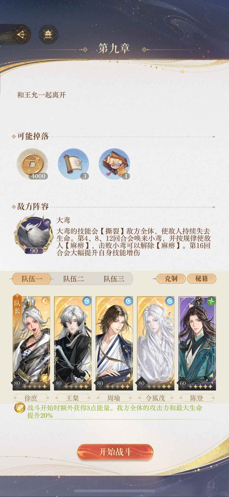 9-20大鸢机制:大鸟放完大招会召唤一只小鸟,并且麻痹我方前1.2位密探,输出不够的话可以把盾型密探放或者血量高的密探放1.2位,输出放在五号位,大鸟普攻会攻击我方2.4位的密探(推荐放血量高的密探)。秒掉小鸟即可解除麻痹,注意大鸟在16回合会大幅度提升攻击,要18回合内秒掉大鸟。