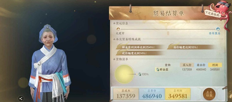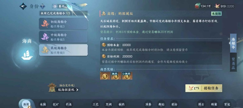 本周贸易可获得96万左右金币,海舶令的利润是随机刷新的,我这周是20万+20万+50万+6万(3个高级1和中级)