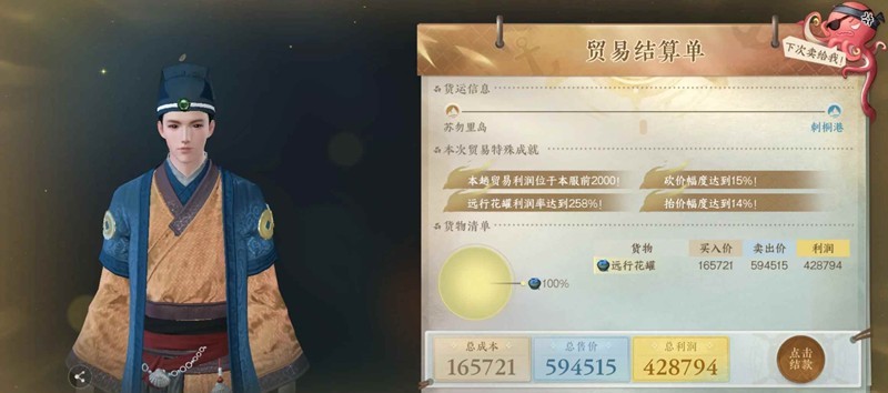 苏勿里买远行花罐卖到刺桐港,利润42w+
