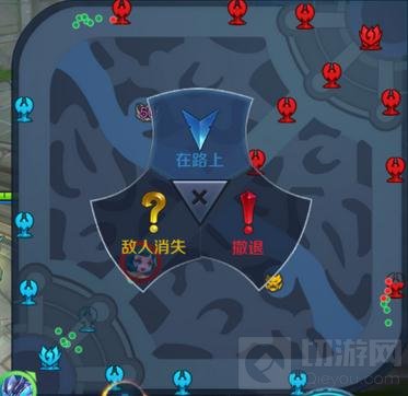 信号盘包括3种全新的信号按钮和1个取消按钮,此时将手指往你所想要发送的信号按钮位置滑动,在不同按钮的位置抬起手指,则会在你按压的位置向所有队友发送对应信号,比如图示我在中路位置按压呼出轮盘后,向上滑动并抬起手指,给队友放送信号的结果是: