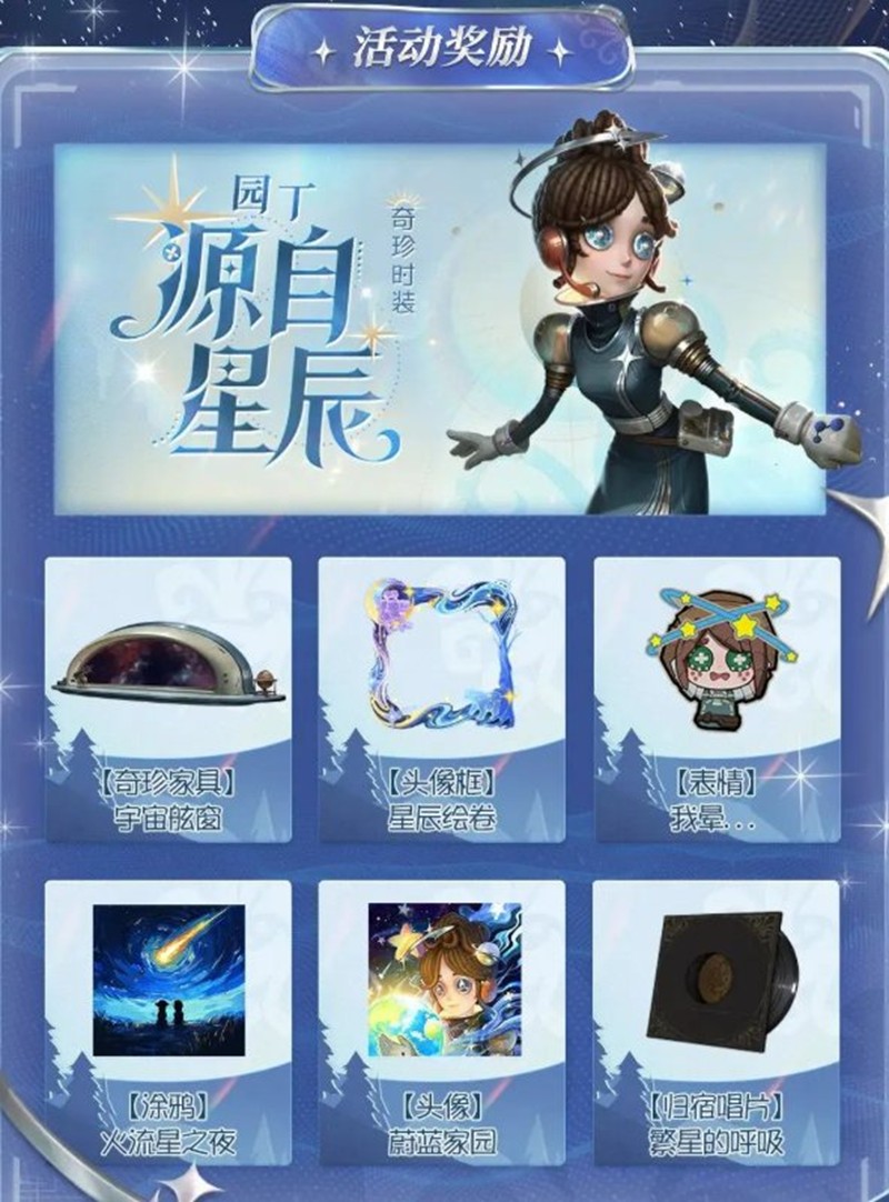 活动奖励包括【奇珍时装】园丁 - 源自星辰、【奇珍家具】宇宙舷窗,以及联动头像框、头像、表情、涂鸦等。