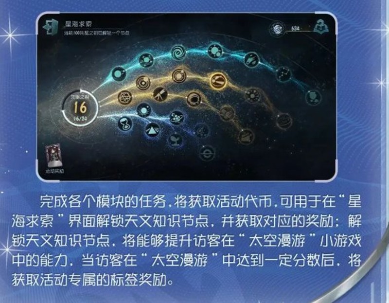 活动时间内,访客们可通过参与活动剧情、天文问答、太空漫游等多个活动模块或常规对战以获取活动代币,于“星海求索”界面中解锁各类天文知识节点,并领取对应奖励。活动奖励包含:【奇珍时装】园丁-源自星辰、【奇珍家具】宇宙舷窗,联动头像框、联动头像、表情、涂鸦等。