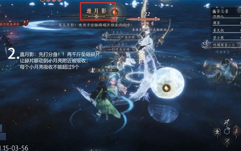 第二阶段是月影婵媛出现,这段最容易出事。首先是地图大,月影婵媛刚开始出现时不好确定方位,其次是大小boss出招很乱,容易莫名中雷电气,建议这个阶段初先在无黄光红光的安全区域猛按卸势,卸势的过程中确定好月影婵媛的位置,以便把握大小boss的出招。期间抽几个人打死月影婵媛,并把月亮碎片踢到小月亮里,小月亮踢满9个不影响可以继续踢,一个奶圈只要人都在圈里能奶住。所有月影婵媛消灭后望月婵媛会回到地图中央打小月亮,这段时期可以打输出,不需要顾忌黄光,但奶妈要注意放奶阵,其他人要集中进奶阵回血。这一阶段要找好视野,保证自己能观察到大小boss的位置,以便躲避金红圈和剑气。小月亮被炸完以后boss会回到第一阶段的招式,专注输出即可。