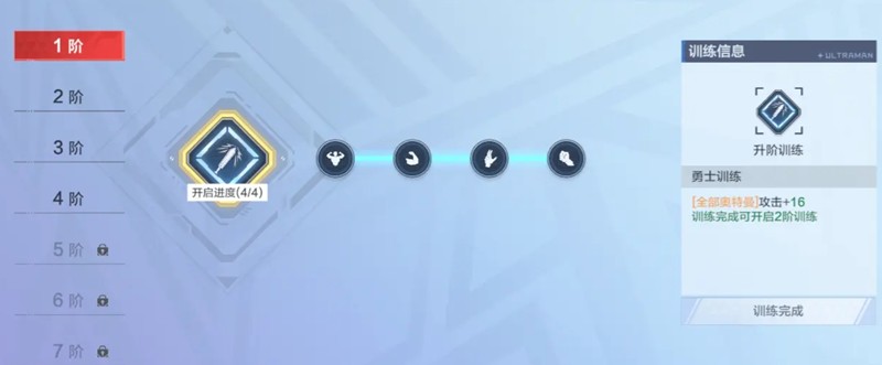 技能升级需要消耗不同品质的技能芯片。每个奥特曼都有独特的专精方向,分为力量、技巧、精神和体魄四种类型。迪迦就是典型的力量专精型角色。通过奥特训练场获取战斗记录议,可以提升专属等级,进而增强技能效果。