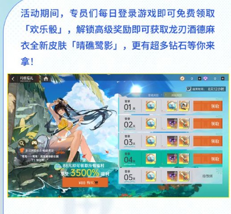 活动期间,专员们每日登录游戏即可免费领取「欢乐骰」,解锁高级奖励即可获取龙刃酒德麻衣全新皮肤「晴礁鹭影」,更有超多钻石等你来拿!