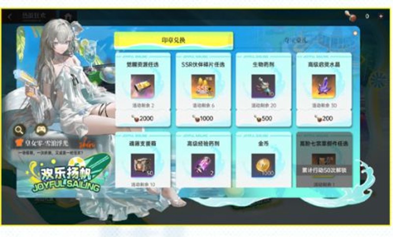 活动期间,专员参与活动即可获得活动限定货币「欢乐印章」。在【欢乐扬帆-印章兑换】中消耗限定货币即可兑换多样奖励,包括「限定UR伙伴任选」、「热浪狂「稀有SSR龙文任选」、欢觉醒资源任选」等;也可在【夺宝豪礼】中解锁活动限定礼包,获取欢乐骰、钻石等道具。